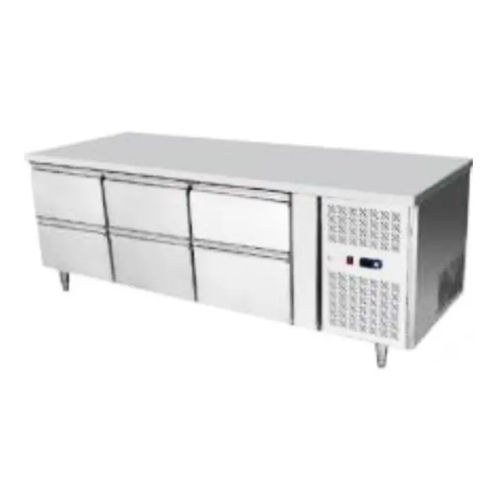 – ตู้แช่แข็งเคาน์เตอร์สแตนเลส 6 ลิ้นชัก ควบคุมอุณหภูมิความเย็นช่วง -22 ถึง -17 องศาเซลเซียส เหมาะสำหรับเก็บวัตถุดิบสด