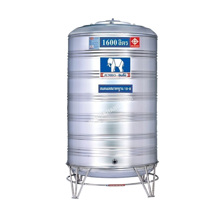 ถังน้ำสแตนเลส 1600 ลิตร Jumbo ทรงก้นนูน รุ่น JMCB1600 ขนาด กว้าง 1.08 เมตร ความสูงรวม 2.13 เมตร ท่อน้ำเข้า 3/4 นิ้ว ท่อน้ำออก 1 นิ้ว แทงค์น้ำ จัมโบ้ มีความแข็งแรงทนทาน ปลอดภัยสำหรับน้ำดื่ม ราคา ถูก ได้มาตรฐาน มอก. 989-2533 รับประกัน 5 ปี